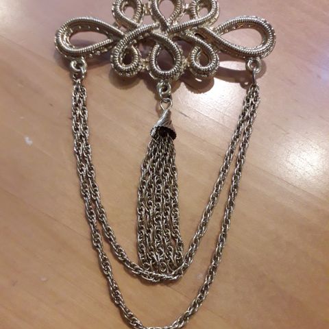 Kuvien kaksi rintaneulaa. Metallia, kullan ja hopean väriä. Kirkas kivi latvassa. 3 cm x 2,5 cm, syvyys n. 1 cm. Yhteispaino 11,3 g.