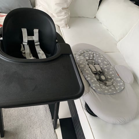 Yhdelle lapselle uutena ostettu ja suoraan käytöstä myytävä Stokke steps syöttötuolin istuimen pienentäjä turvakaarineen sekä tarjotin.