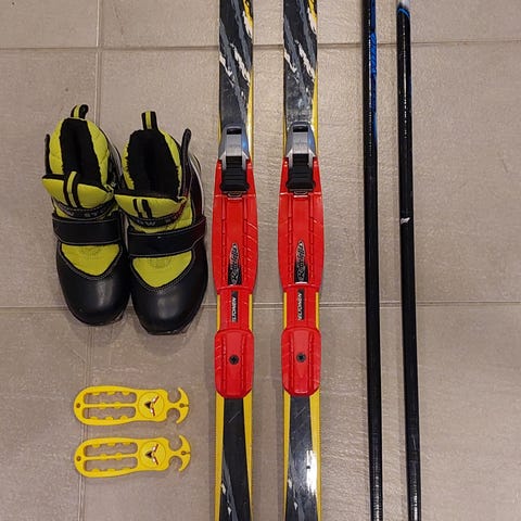 Lasten Peltosen NNN-siteillä 140cm sukset, 100cm sauvat ja Fischerin koko 35 NNN-monot.