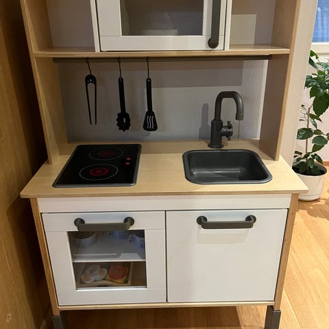 IKEA lasten leikkikeittiö, valmistettu puusta. Keittiössä on kaksi liesitasoa, allas ja hana sekä kaapit ja hyllyt säilytystilaa varten. Leikkikeittiö on tarkoitettu lasten käyttöön.