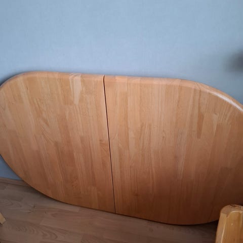 Puu ruokapöytä ja neljä puista tuolia. Sopii ruokailutilaan tai keittiöön.