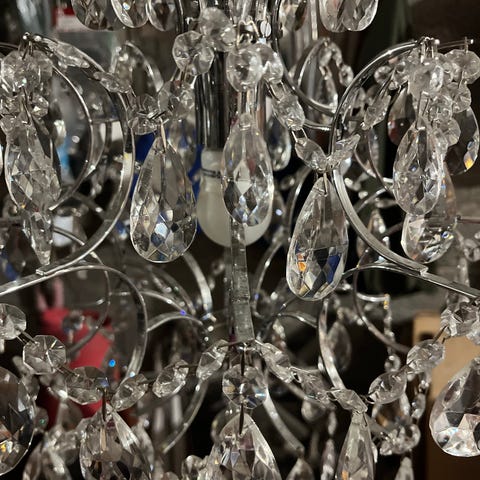 Elloksen kattovalaisin. Kork. 50 cm, lev. 40 cm. Muutama lasiprisma puuttuu. Vain nouto.