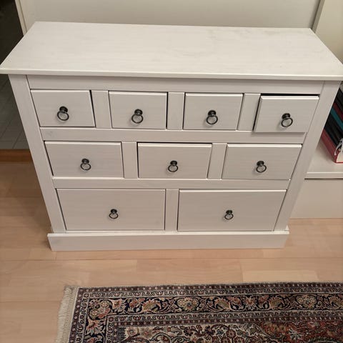 Valkoinen täyspuinen senkki kahdella laatikostolla