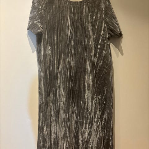 Hopea/metallinhopea juhlamekko, koko S, yläosa-helma noin 70 cm, vyötärönympärys noin 68 cm. Säädettävät olkaimet, sivussa vetoketju, kumilenkki helmaa pitkin (pallohame), 100% puuvilla.