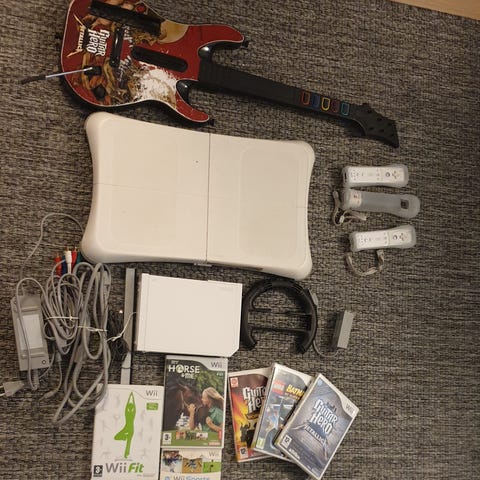Wii konsoli, ohjaimet, pelit, piuhat ja tv