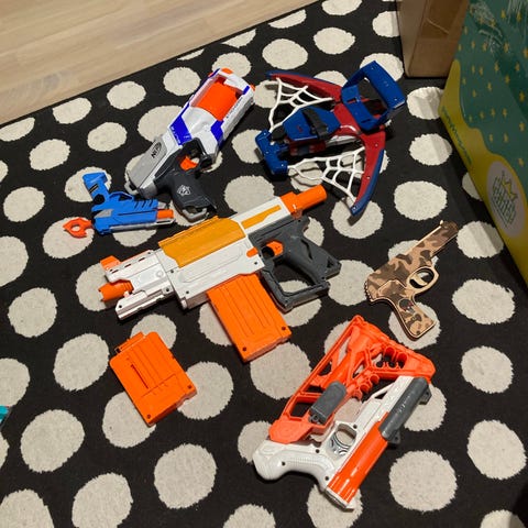 Myydään Nerf leluaseita - paljon eri malleja ja värejä. Mukana useita aseita ja lisävarusteita kuten lippaita ja tähtäimiä. Hinnat 10-15€/kpl, kaikki kerralla 70 € (10 asetta + lisävarusteet ja panokset).