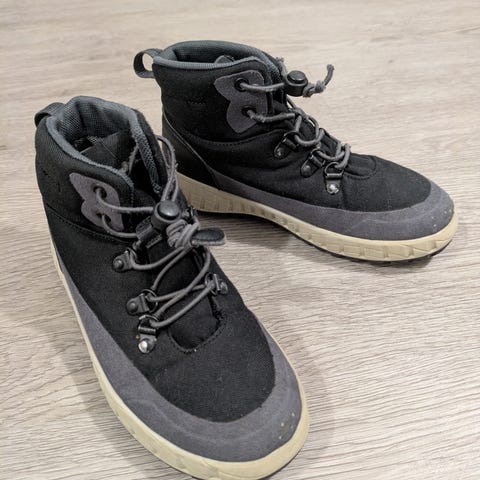 Muutama halkeama varressa. Pitäneet kuivana. Sisähuopa nukkaantunut.