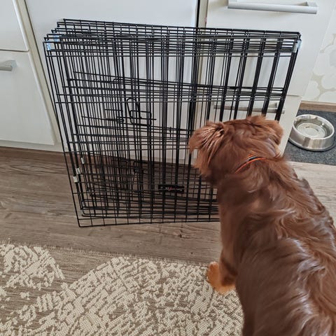 Metallinen koirankuljetusaitaus musta, jossa on irrotettava muovinen pohja. Sopii lemmikkieläinten kuljetukseen ja pidempiaikaiseen käyttöön. Aitaus on kokoontaitettava ja siinä on kahva kantamista varten. Kulkee mukana välillä Mikkeli-Lahti-Helsinki esim huoltoasemalle .