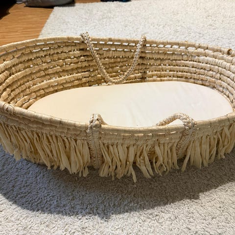 Ok kunnossa oleva mooses-kori, ei purkaumia korissa ja irroitettavat kangasosat siistit. Kuvissa näkyvä patja kuuluu pakettiin.