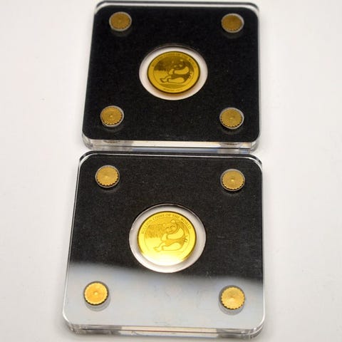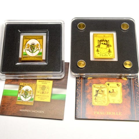 Huomioithan, että tämä erä sisältää pieniä kultakolikoita tai -mitalia, jotka on valmistettu erittäin ohuesta kullasta. Herkkyytensä ja taivuteltavuutensa vuoksi tällaiset esineet on usein kiinnitetty akryyliin tai kapseloitu muoviin vaurioiden estämiseksi. Jos sinulla on kysyttävää tästä erästä, ota rohkeasti yhteyttä meihin.