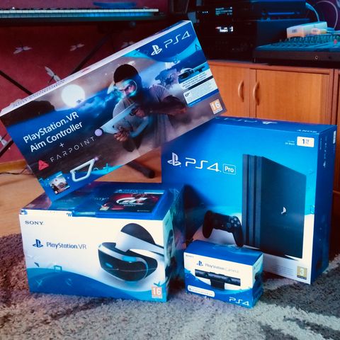 VR-lasit, kamera ja kaksi PlayStation Move -ohjainta, Pöytä laturi Move ohjaimille, Aim Controller kivääriohjain ja PlayStation VR -virtalähde ja kaapelit.