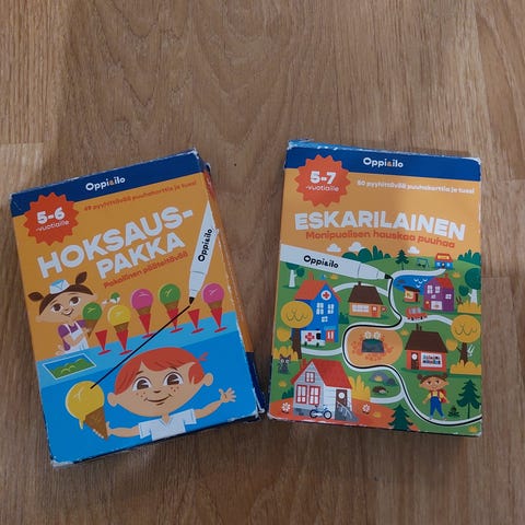 Oppi & ilo -sarjaan kuuluvat ’Muodonmuutos’ -puuhakortit ja pyyhittävä tussi. Suositusikä 6-10v.