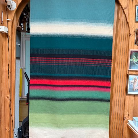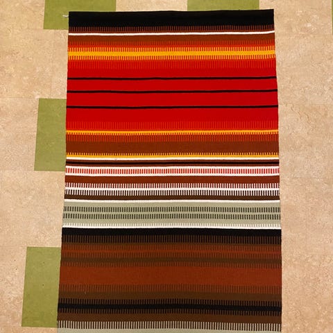 Käsinkudottu raanu, jossa on raidallinen kuviointi. Värit sisältävät mustaa, punaista, keltaista ja vihreää. Matto soveltuu sisustukseen. Upea vintage käsityö