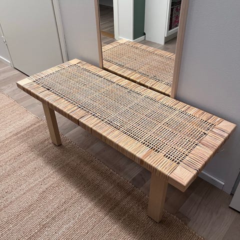 Sohvapöytänä pidetty Ikean Stockholm penkki (ei tuotannossa). Hyvässä kunnossa, normaalia rottingin värin vaihtelua. Vain yhdessä kohtaa sivussa on rottinki "löystynyt", mutta tätä voi esim. liimalla korjata.