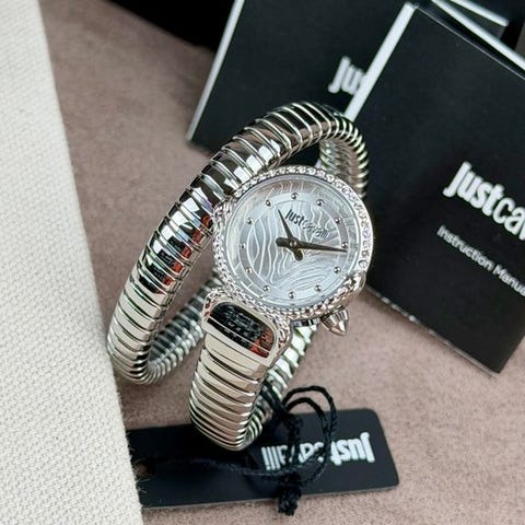 Kaunis Just Cavalli -kello, viitenumero JC1L310M0085, malli Animalier. Kellossa on kvartsikoneisto ja helppolukuinen kellotaulu, jossa on kontrastinväriset osoittimet ja indeksit. Indekseissä on myös kiviä ja Cavalli-logo kello kuuden kohdalla.