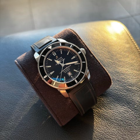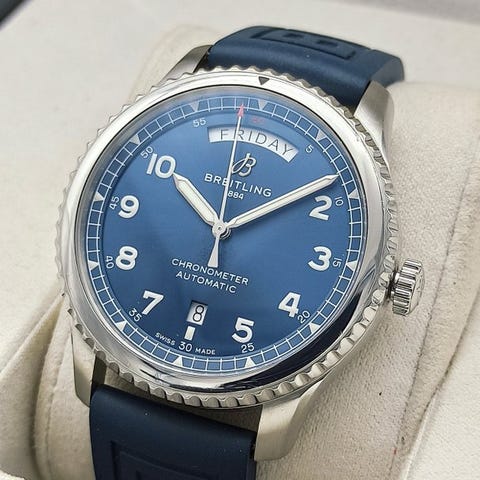 Vielä elävöittäen 1940-luvun eleganttia henkeä, Breitling Premier Automatic 40 (Ref: A37340) on hienostunut huippuosaaminen hienovaraisessa ylellisyydessä. Kellossa on 40 mm ruostumattomasta teräksestä valmistettu kotelo, jonka mittasuhteet ovat täydelliset, ja kiehtova aurinkopainotteinen sininen kellotaulu. Poiketen tyypillisistä Breitling-malleista, jotka ovat monimutkaisia ja toiminnallisia, tämä kello tarjoaa yksinkertaisen estetiikan, jossa on sovellettu indeksit ja selkeä pieni sekuntinäyttö kuuden kellon kohdalla. Kello on erinomaisessa kunnossa ja näyttää upealta ranteessasi. Uusi, käyttämätön jälkimarkkinan nahkainen ranneke on asennettu välitöntä käyttömukavuutta varten. Tarjolla on myös jälkimarkkinan matkakotelo, joten tämä Premier on hienostunut valinta sekä juhla- että arkikäyttöön.