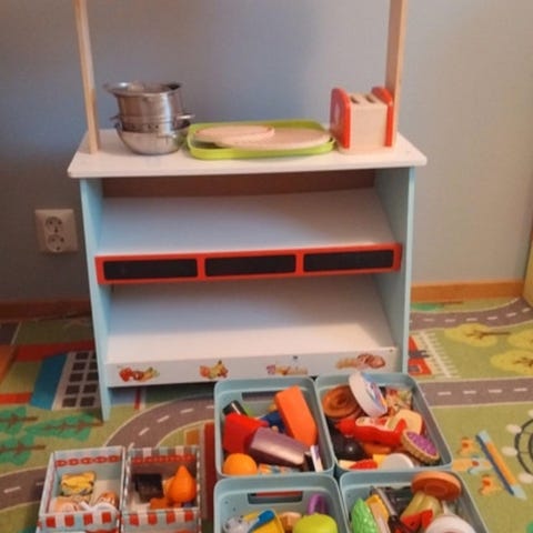 Tässä voi myös leikkiä leikkikeittiö tä halutessaan ja laittaa hyllyille leikkiastioita ja hellan (meillä oli tehty pienestä pahvilaatikosta 🤭)