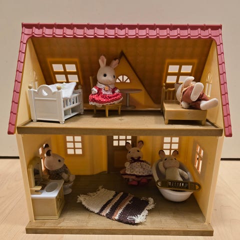 Sylvianin perheen talot ja vähän tavaroita. Toisesta sängystä yksi jalka poikennut