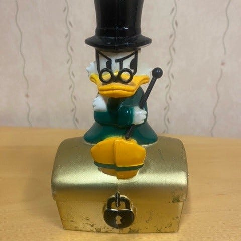 Merita Roope Ankka säästölipas. Kulunut, likainen ja pölyinen. Kävelykeppi katkennut, avainta ei ole. Joku 10 pennin kolikko siellä taitaa olla.
