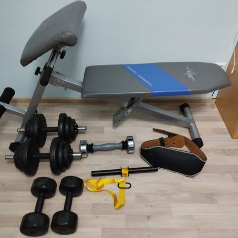 Täysi kotikuntosali avaamattomassa pakkauksessa.