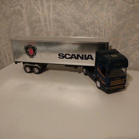 Scania 143M kuorma-auto punaisella värillä. Malli sisältää kuomun ja yksityiskohtaisen ohjaamon. Sopii kuljetustehtäviin ja keräilyyn.