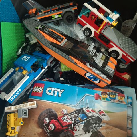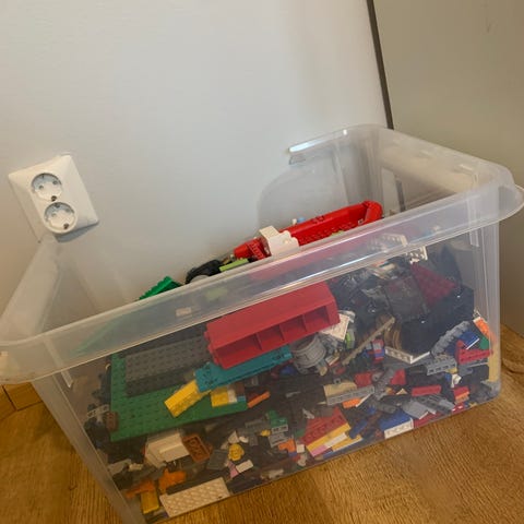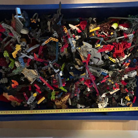 Laatikollinen erilaisia pienlegoja ja rattaita.