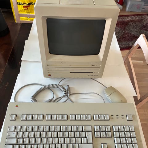 Tarjouksia kuunnellaan. 80 luvun Apple Macintosh tietokoneita. Macintosh Plus käynnistyy ja yrittää lukea diskettiä. Toinen ei inahda. Irrallinen näyttö ainakin antaa vihreätä valoa. 3.5" disketti lukija ja stylewriter printteri. 2 kpl hiiriä ja 2kpl näppäimistöjä. Kellastuneita. Mukaan vielä AT-1414 retro modeemi