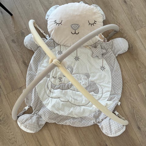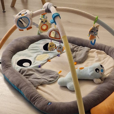 Meriteemainen leikkimatto vauvalle. Simpukan muotoisessa leikkimatossa on kaaret, joista roikkuu erilaisia aktiviteettileluja, jotka helisevät, rapisevat tai vinkuvat.