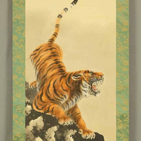 Runollinen japanilainen ripustuskangas kuvaa lempeästi shidare-zakura-oksaa — eleganttia itkeväkirsikkaa. Pehmeän vaaleanpunaiset kukat leijuvat alas pitkissä, sulavissa nauhoissa, herättäen esiin varhaisen kevään hiljaisen kauneuden. Hienovaraisesti sävytetyn taustan vasten taiteilija Keisen vangitsee terälehtien herkkää rytmiä, jotka huojuvat tuulessa, ja himmeä hämyinen kuu lisää vuodenaikojen rauhallisuuden tuntua. Allekirjoitettu ja sinetöity ‘Keisen’ 佳泉, tämä teos heijastaa perinteistä japanilaista arvostusta ohikiitäviä luonnon hetkiä kohtaan sekä kachō-ga (kukka- ja lintamaalausten) hienostunutta herkkyyttä. Pituudeltaan korostettu pystysuuntainen muoto korostaa kukkien vuodatusta, tehden tästä ripustuskankaasta erityisen sopivan kaapille tai korkeille seinätiloille. Rauhallinen ja tunnelmallinen teos, joka tuo kevään runollisen viehätyksen mihin tahansa sisustukseen.