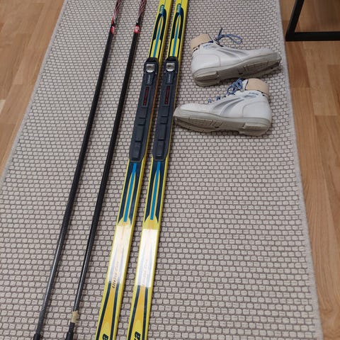 Ostetaan perinteisen sukset jäykkyys 78 kg painoiselle miehelle sekä niihin käyvät monot numero 42 ja sauvat.