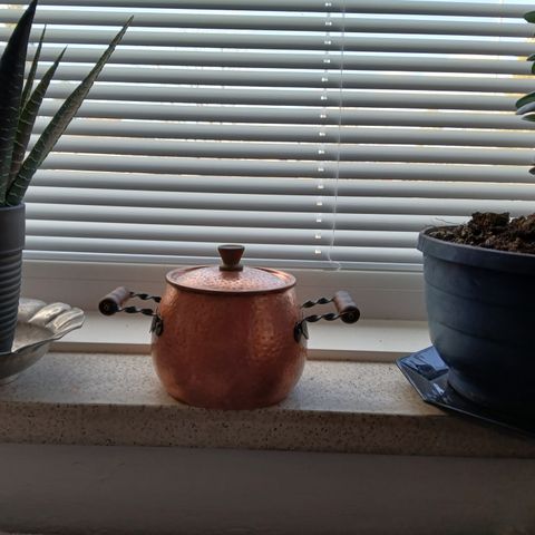 Kuparikattila/kastikepannu puuosilla, suuaukko 13cm ja reunan korkeus 6cm. Kannellinen. Patinaa/pinttymää.