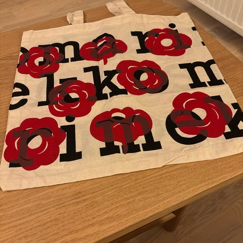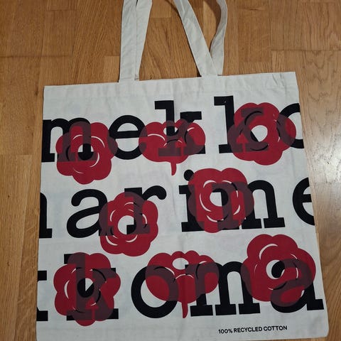 Käyttämätön Marimekon kangaskassi. Kukkakuvioiden väri violetti.