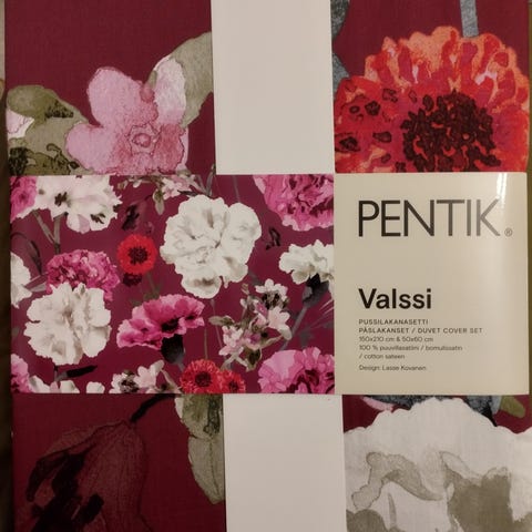 "Valssi-kuosi on saanut inspiraationsa suurista, aromikkaista kukkakimpuista. Syksyyn ja lähenevään jouluun Valssi-kuosi saa uuden värityksen viininpunaisella taustavärillä. Pussilakanasettiin sisältyy 150x210 cm pussilakana sekä 50x60 cm kokoinen tyynyliina. Vuodevaatteet ovat 100% puuvillasatiinia ja ne voi pestä 60 asteessa. Puuvillasatiini on puuvillaa, joka on kudottu käyttäen satiinisidosta. Satiinisidoksinen kangas on tavallista puuvillakangasta kiiltävämpää, sileäpintaisempaa ja tuntuu iholla pehmeältä. Tuotteen lankaluku eli kankaantiheys (TC) on TC200. Öko-Tex -sertifioitu tekstiili."