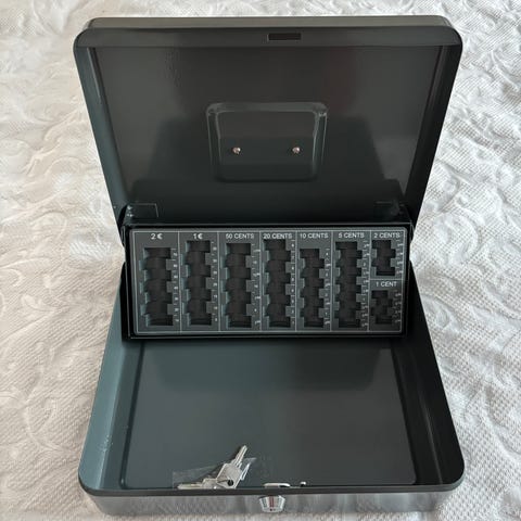 Teräksinen lipas, ”rahalipas” , pieni ”kassakaappi”, rahojen ja arvotavaroiden säilytykseen.