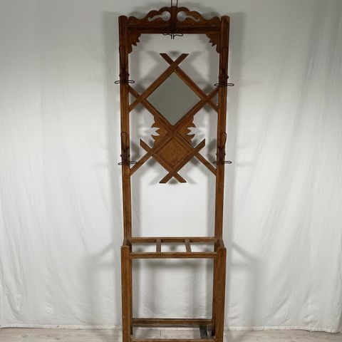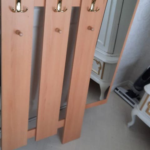 alhaalla viisi ripustinta vaatteille ja hatuille sekä alkuperäiskuntoinen peili