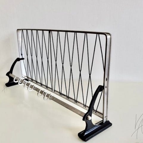 naulakon takana kaksi tukevaa metalli-istukkaa ruuveille tai koukuille seinälle ripustusta varten
