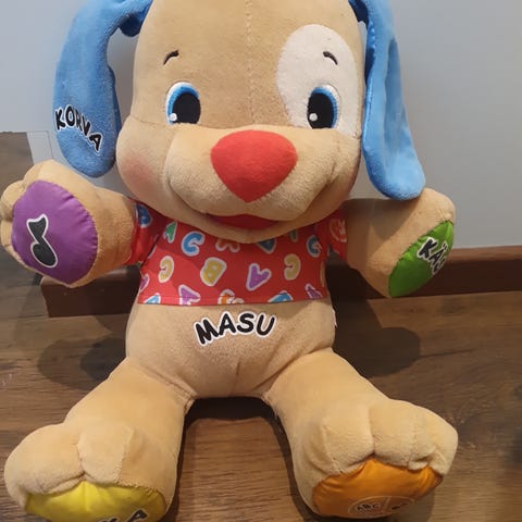 Myydään hyväkuntoinen puhuva koira pehmolelu.