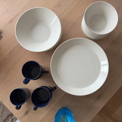 Iittala astiasto, sisältää lautasia ja kulhoja. Väri valkoinen. Kunto hyvä käytetty, ehjät. Jonkin verran tummentumaa ja pintanaarmuja nähtävissä lautasissa, en ole koittanut poistaa. Ihan käyttökelpoisia ovat mielestäni.