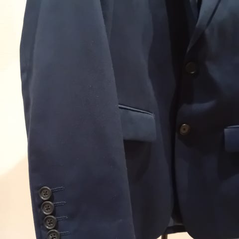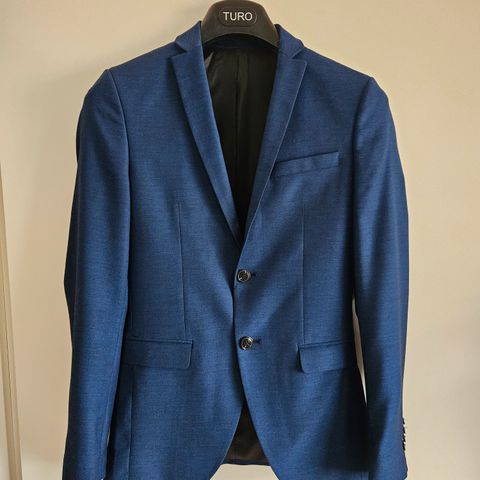 Uudenveroinen pari kertaa käytetty muodinmukainen kapealinjainen Jack & Jones -puku. Sopii n. 170-180 cm pitkälle hoikalle.