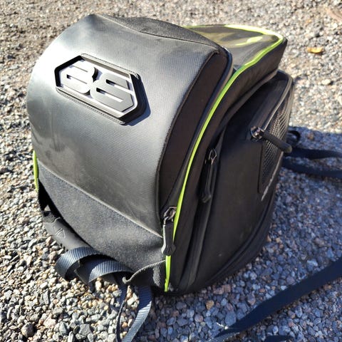 Punainen moottoripyörän takalaukku, jossa on musta pehmuste.