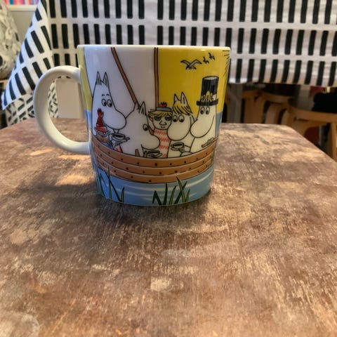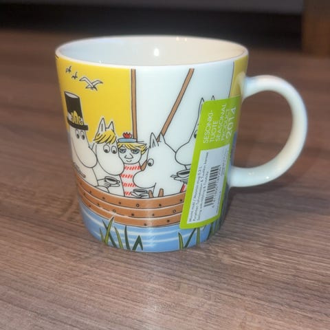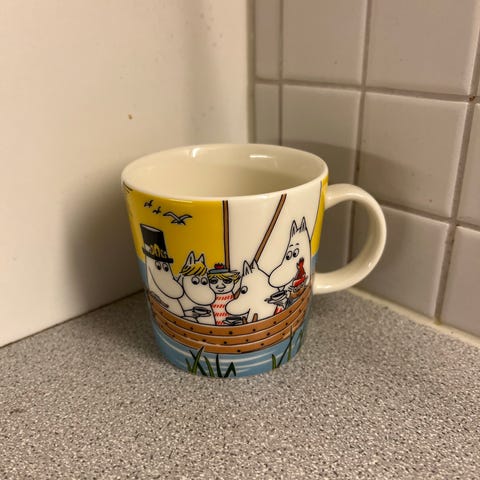 Kuvan muumimuki, vähäisessä käytössä ollut, ei siis tarraa, mutta hyvässä kunnossa.