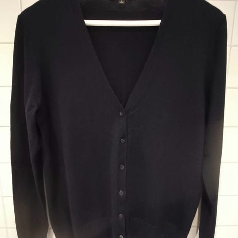 Musta, käyttämätön neuletakki, puuvillasekoite (materiaalina akryyli/puuvilla/polyesteri). Mieluiten nouto Espoosta.