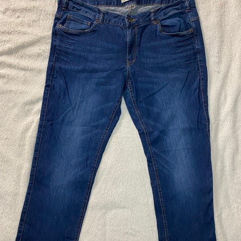 Kuvanmukaiset farkut. Materiaali kulunut haaroista.