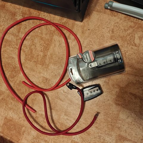 Tammitynnyrissä maturoitunutta autohifiä. Kunnosta ei mitään takuuta. Ihme toki jos tuo sulake + pesä ei toimisi oletetusti. Virtakaapeli mallia OFC ja kuoren päältä n 12mm ja kaapelipunos n 8mm (~60mm2). Kaapelia sulakkeen toisessa päässä n 50cm ja toisessa n 150cm.