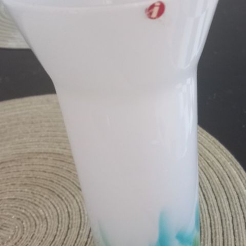 Iittala lasimaljakko, jossa on sinivihreä kuviointi. Maljakko on valmistettu lasista ja soveltuu kukkien tai muiden koriste-esineiden esillepanoon.
