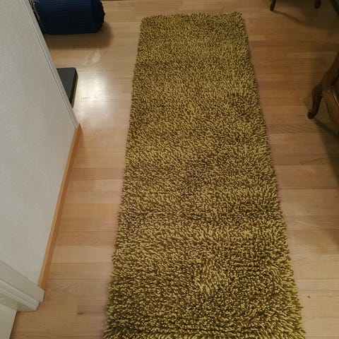 Sinimusta käsintehty, käyttämätön villalankamatto.