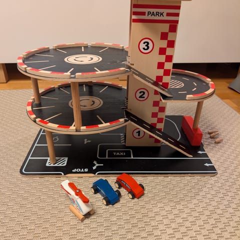 Kaunis puinen parkkitalo merkiltä Kids concept. Tukevampi ja nätimpi kuin muoviset. Mukaan tulee puiset autot ja helikopteri. Leikeissä rakastettu, tavanomaisia käytön jälkiä. Hissin naru irronnut leikeissä, eli sellaisen uuden voi kiinnittää. Meillä hissiä on liikuteltu vaan käsin. Nouto Munkkiniemestä.