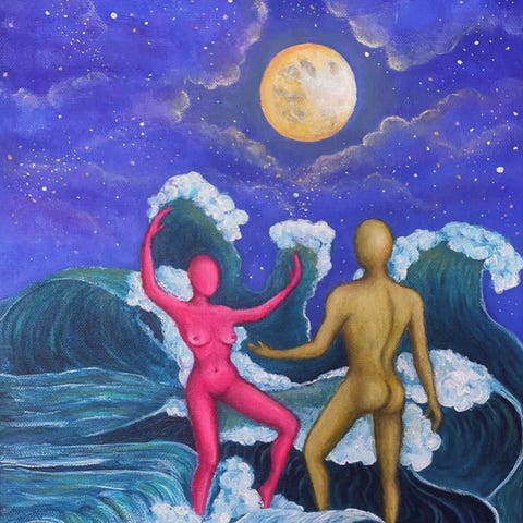 Akryylimaalaus, halkaisijaltaan 30 cm. Maalattu taiteiljalaatuisilla väreillä puuvillakankaalle, viimeistelty vernissalla, joka hylkii likaa ja pölyä. Ripustusvalmis.