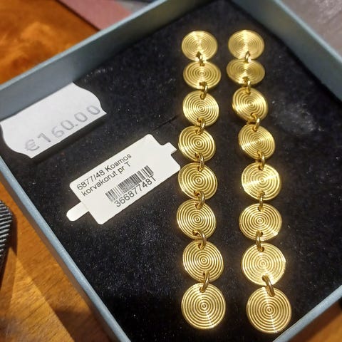 Kosmos-korvakorut pronssi; Kullanhohtoisina välkkyvät pitkät pronssiset Kosmos-korvakorut eivät jää keneltäkään huomaamatta. Voit tehdä niistä helposti arkisemmat korvanapit pujottamalla riipusosat pois kiinnitystapista. Tappikiinnitys, tappi ja taustanasta hopeaa.