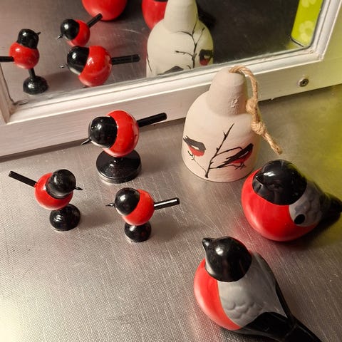 Myynnissä kuvien ehjät sekä siistit punatulkkuaiheiset esineet: